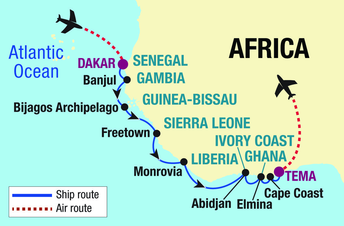 Join us as we sail from Senegal to Ghana with calls in Gambia, Guinea-Bissau, Sierra Leone, Liberia, and Ivory Coast. Experience the Africa that few people have a chance to see, a vast continent of awe-inspiring beauty, natural drama, hope, promise, friendship, and generosity. Many past travelers say that a trip to Africa changed their lives – broadening their imagination of the world in extraordinary ways. Our cruise along West Africa’s coast, featuring some of the continent’s most attractive places, is rare, indeed.