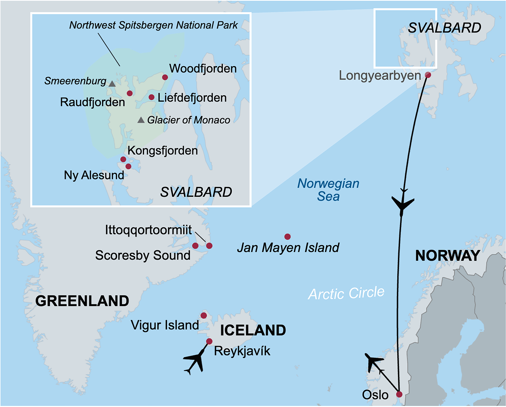 On this trip of a lifetime, sail to the Far North and experience unforgettable polar regions — and the phenomenon of the midnight sun — in the Arctic Circle. Begin in Reykjavík, Iceland, and board the deluxe small shipAtlas World Voyager for a luxurious 9-night cruise. Sail to Vigur Island and navigate the unforgettable fjords of Greenland. Then exploreislands in Norway’sSvalbard archipelago. Cruise along spectacular icy coastlines, keeping your eyes peeled —and binoculars and cameras at the ready — for polar bears, walrus colonies and a plethora of arctic bird species. Six different seal species have been spotted in these waters, and 14 different species of whales! In addition to wildlife, enjoy vistas that are simply spectacular — sharp cliffs, jagged mountains, immense frozen glaciers and, of course, icy seas. Program includes a flight from Longyearbyen, Svalbard, to Oslo, Norway, andone night at the first-class Grand Hotel Oslo. Enhance your incredible adventure with an optionalpre-program extension in Reykjavik and/or a post-program extension in Oslo.