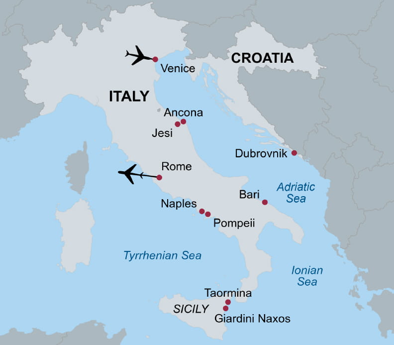 Immerse yourself in magnificent scenery and enthralling history on this exclusively chartered, 7-night cruise aboard the deluxe, all-suite Star Explorer. From the gorgeous city of Dubrovnik to the lively port city of Bari and legendary sites in Sicily, explore fascinating destinations while cruising in luxury. Discover the remarkable history of Ancona, settled and named by the Greeks in 390 B.C., and the archaeological ruins of Pompeii, preserved in time since the eruption of Mt. Vesuvius in A.D. 79. Be awed by the Romanesque architecture of Dubrovnik’s Cloister of the Franciscan Monastery and the sweeping views from Taormina’s renowned Greco-Roman amphitheater. Since you’re traveling during the quiet season, you’ll experience authentic local interactions, comfortable temperatures, fewer tourist crowds and the opportunity to see these destinations as locals do. As you travel, expert guides and speakers will share insightful perspectives on the captivating history and culture of the region. And of course, savor delicious Italian food and wine and unparalleled views throughout!