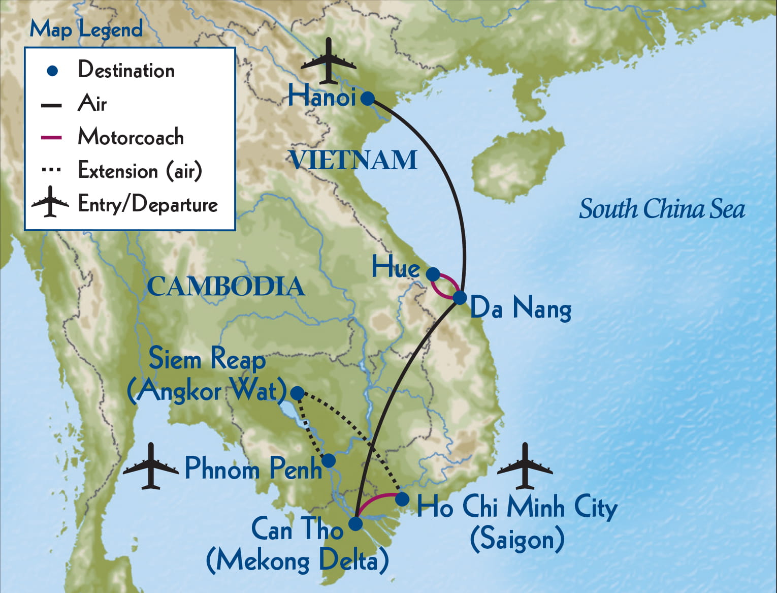 Encounter Vietnam’s breathtaking natural beauty, abiding tradition, and profoundly hospitable people on this comprehensive 15-day small group journey. Get acquainted with French-accented Hanoi during a three-night stay, touring historic sites and sampling local cuisine. On a full-day Ha Long Bay excursion, explore this stunning waterscape by boat. Spending three nights in a beachfront hotel in Da Nang, tour the acclaimed Cham Museum and Hoi An’s charming Old Town, a UNESCO site where you enjoy a cooking lesson. In Hue, explore the vast Imperial Citadel, take a cyclo ride, and cruise on the Perfume River. Then experience river life with two nights in the storied Mekong Delta, journeying by boat to a floating market and exploring by sampan. See a farming settlement’s daily life. A three-night stay in vibrant Saigon with touring and independent exploration concludes the journey. Discover Angkor Wat’s amazing temples and Phnom Penh with an optional 5-day/3-night post-tour extension.