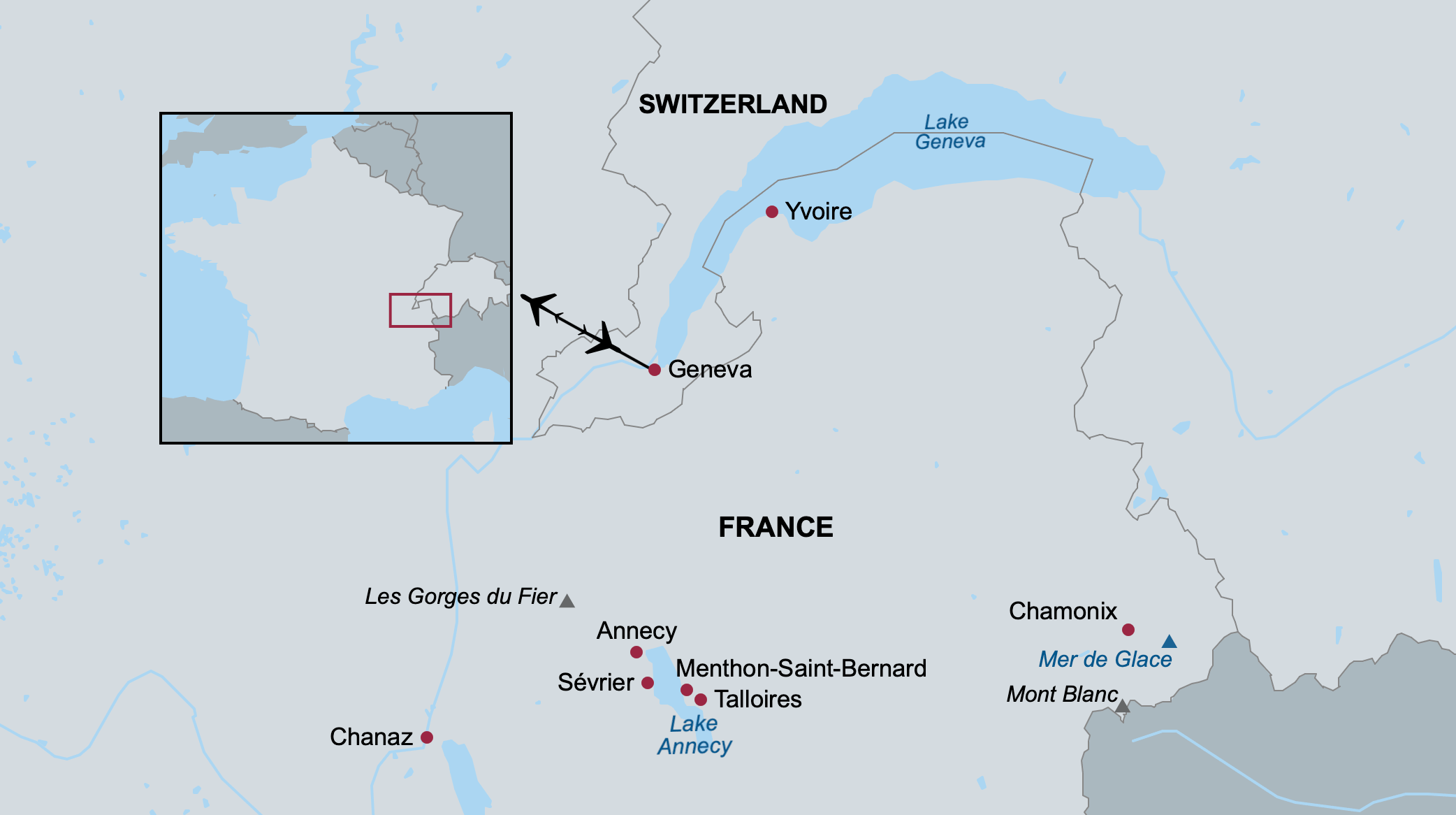 The Savoie region of France, nestled in the Alps and bordered by Switzerland, beckons with its sublime vistas of shimmering glacial waters, soaring Alpine peaks and cozy, inviting villages. This 9‑day, 8‑night French land trip boasts medieval sites to discover and stunning natural beauty to admire. Unpack once at the lovely Imperial Palace Hotel on the shores of Lake Annecy, then spend your week exploring this beautiful area. Discover the spectacular Chateau de Menthon-Saint Bernard, an architectural jewel, and take a private tour of a bell foundry. Marvel at mountain vistas, a glacier, an ice cave and a river-carved gorge. In delightful towns, sample and learn about delicious provisions created by local artisans — wines, cheeses, coffee, and hazelnut and walnut oils — and dine on delectable specialties such as raclette and tartiflette. On a boat, cross deep‑blue Lake Annecy; on a cable car, soar high above Chamonix for views of Mont Blanc; on a cogwheel train, ascend to Europe’s largest glacier. Throughout, delight in the incredible scenery, mouthwatering cuisine and welcoming culture.
